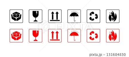 Set of Shipping Icons: Fragile Glass, This Side Up, Keep Dry, Recycle, and Flammable Symbols.