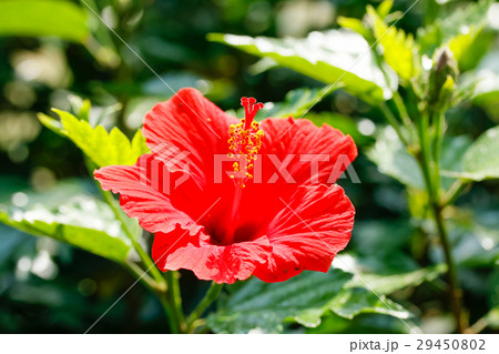 Red Hibiscus Flower with Water Droplets. Watercolor illustration.