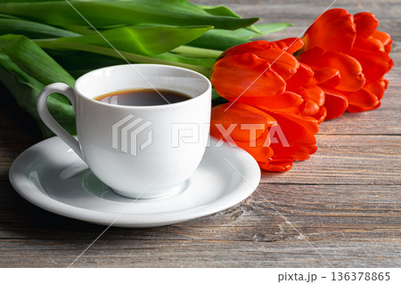 Cup of coffee and red tulips on a wooden surface.