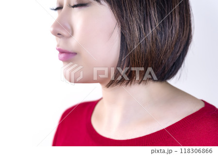 Chinese new year festival, Beautiful Young asian woman wearing traditional cheongsam qipao dress with gold necklaces on red background,
