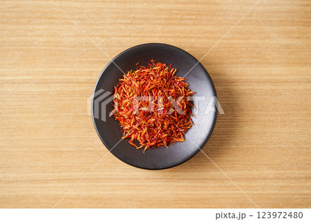Dry safflower in woonden spoon.