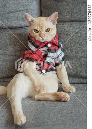 Burmese kitten in a checkered shirt resting on the sofa at home.