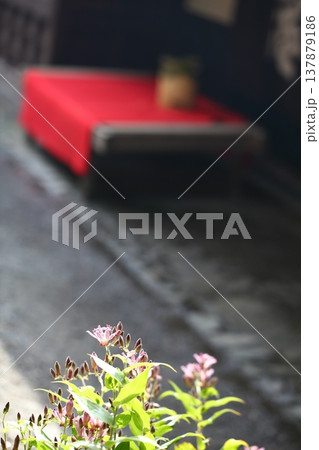 一張凳子,上面蓋著一塊紅布,插著一朵杜鵑花。