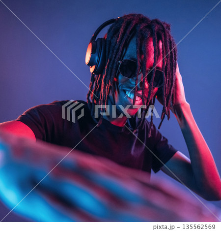 Woman wearing headphones, black jacket and sunglasses, posing against orange studio background in neon. Contemporary style and music.