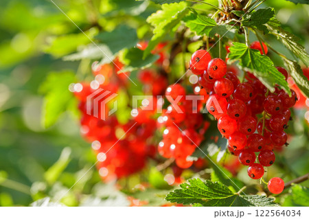 Ripe red currant hanging on bush in garden