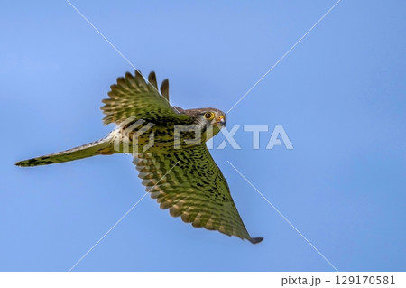 紅隼雌性在藍天背景中平靜地飛翔