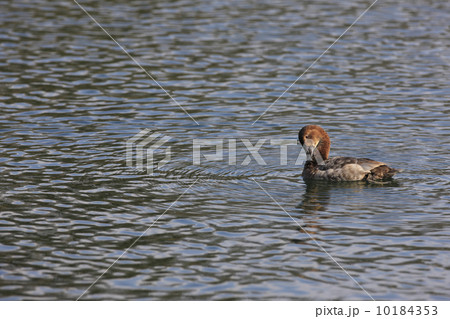 一隻雄性紅頭潛鴨在琵琶湖水道中游泳