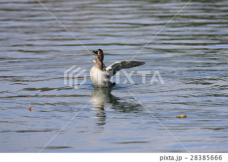 一隻雄性紅頭潛鴨在京都市琵琶湖運河的水面上打盹