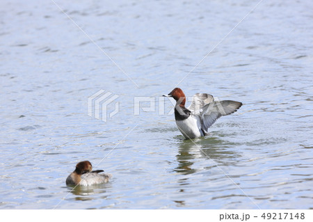 一隻雄性紅頭潛鴨在琵琶湖水道中游泳