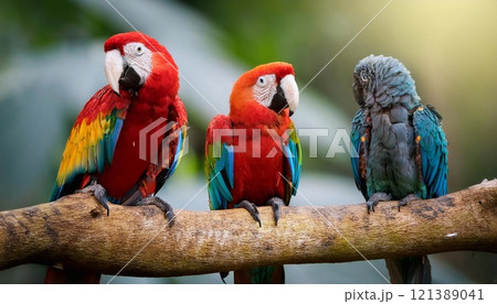 Colorful macaws perched on a wooden branch in tropical rainforest environment, featuring vibrant red, blue, yellow, and green feathers, symbolizing exotic wildlife, beauty of nature, and biodiversity