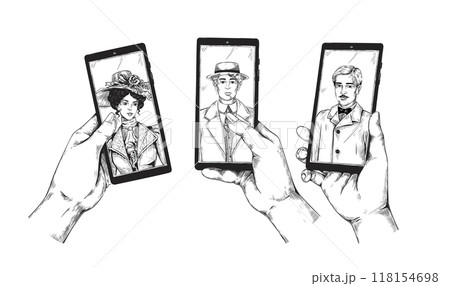 Vintage mobile phone. Hand with old Victorian people portraits. Retro couple photo with gentleman and lady. Smartphone screen. Arm holding device. Aristocrat faces. Vector gadgets set
