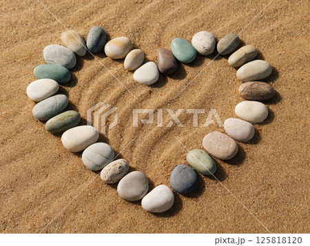 Heart shape made of colorful pebbles arranged on golden sand with soft ripples, symbolizing love, unity, and balance in nature, ideal for wellness, travel, or romantic-themed visual content