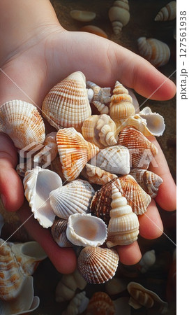 Watercolor illustration of various seashells against soft blended background of blue, pinks and orange. Concept of beach theme, summer vacation or marine art