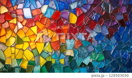 A vibrant mosaic made of irregular, colorful glass pieces, transitioning from warm reds and yellows on the left to cool blues and greens on the right.