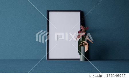 A minimalist interior scene featuring a blank frame and a stylish vase with a plant, blue wall. 3d rendering.