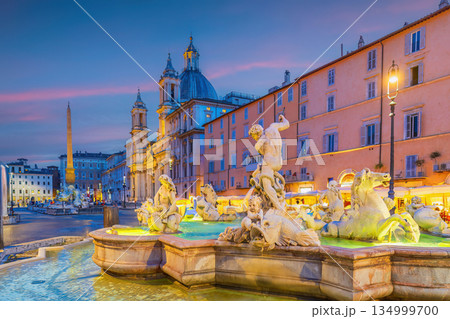 Fountain of the Four Rivers and Sant Agnese in Agone church at Piazza Navona in Rome Italy