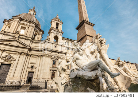 Fountain of the Four Rivers statue and Sant Agnese in Agone church in Rome Italy