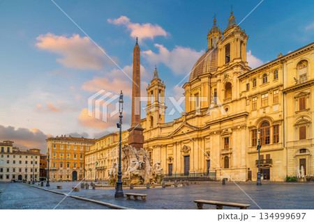 Rome, Italy. Golden hour in Piazza Navona with the famous Egyptian obelisk