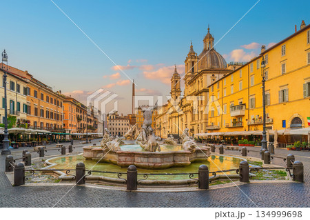 Fountain of Neptune in Piazza Navona at sunrise, full panorama, Rome, Italy