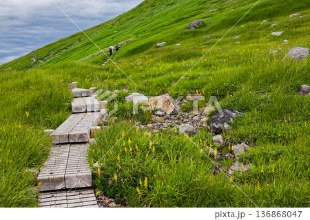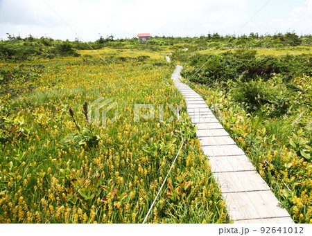 夏季木棧道可俯瞰日向岳和盛開著金雞菊的沼澤景觀