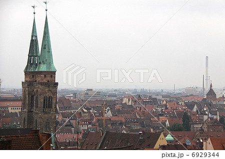 Panoramic view of Nuremberg old town with red roofs and historic church towers, Germany