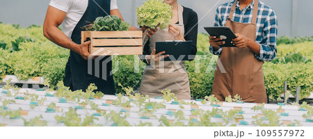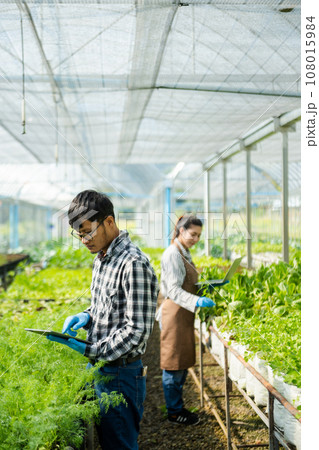 Farmer harvest or inspect farm products quality and fresh vegetables in greenhouse.