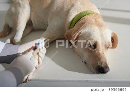 Calm labrador dog waiting when doctor applying yellow vetwrap to fix intravenous catheter on paw