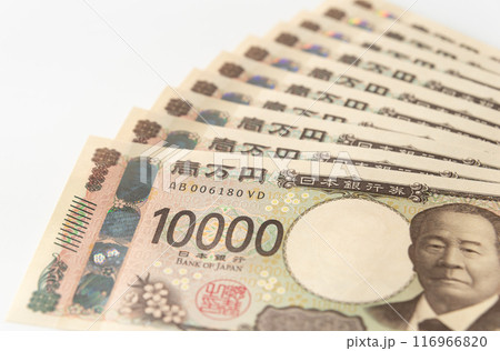 舊版10000日圓紙鈔、黑色皮夾、白色木紋桌