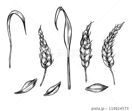 Wheat ear, stalks and grains black white graphic vector illustration isolated. Set of spikelet cereals, barley stems monochrome botanical sketch hand drawn by ink for natural design, grocery, bakery.