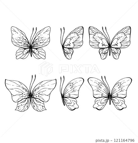 Butterflies flying, delicate line art, clip art. Graphic illustration hand drawn in black ink. Set of isolated objects EPS vector