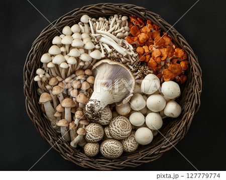 A woven basket brimming with an assortment of fresh, earthy mushrooms, showcasing various shapes, sizes, and textures, with some having intricate caps.