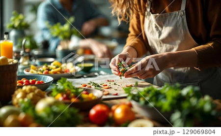 Closeup on young woman cooking salad in kitchen, focus on hands