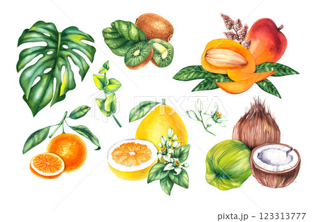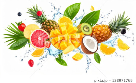 Assorted Colorful Tropical Fruits with Water Splash on White Background Still Life