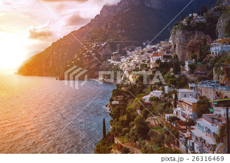 Morning view of Positano cityscape on coast line of mediterranean sea, Italy