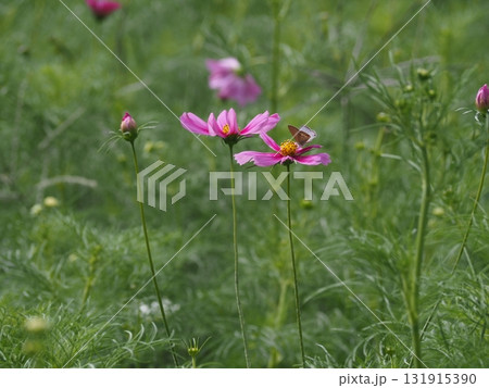一隻灰蝶停在濱離宮恩賜庭園的波斯菊上