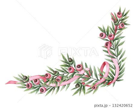 Watercolor pink ribbon twisted with yew branches hand drawn with sparkling and pencil texture. Aesthetic pink and green corner composition. Perfect for Christmas greeting card and seasonal design.