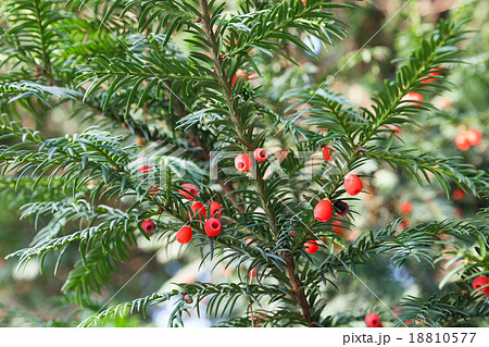 Taxus baccata, european yew. Conifer shrub with poisonous red berry.