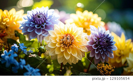 盛開的紫藤和金色的桂花在藍天下閃閃發光