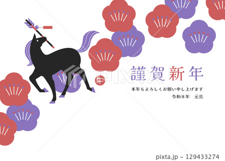 2026 匹馬年:時尚新年賀卡,帶有馬的輪廓、濱矢和梅花(橫向)