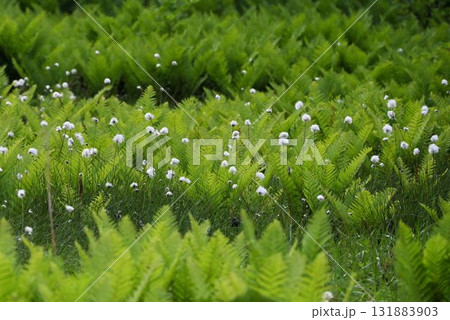 北海道利尻島南濱沼澤的日本蕨類植物中散佈著棉草絨毛的美麗沼澤景觀。