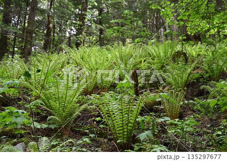 信州上高地山坡上,成簇生長著美麗的蕨類植物。