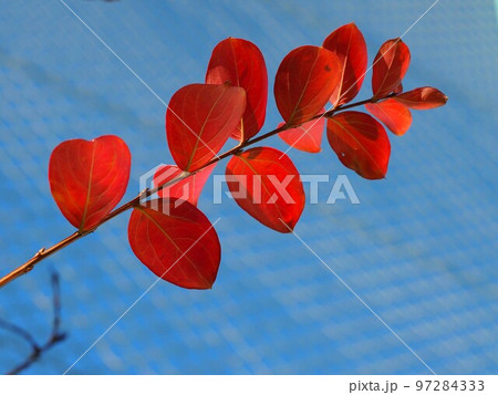 藍天紅紫薇(朝陽下的紅紫薇葉)