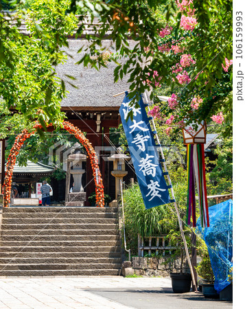 日本的夏季風景,紫薇和旗幟在道路上盛開