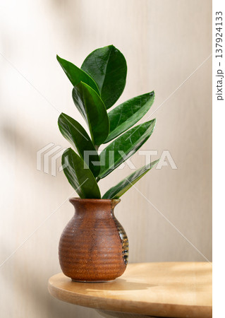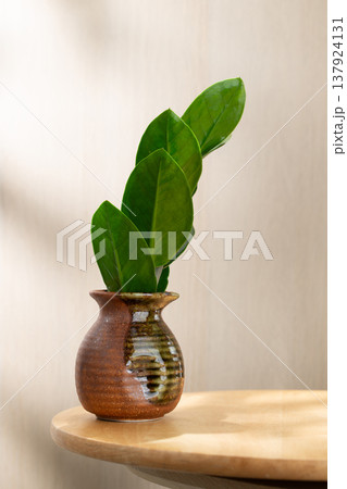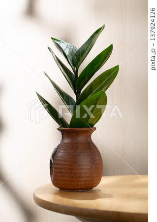 ZZ plant cutting in water in Japanese ceramic vase on wooden table with natural light minimal style