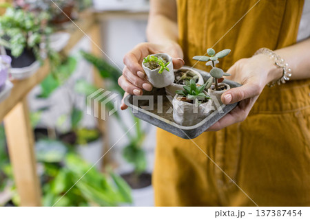 Woman gardener holding set of small ceramic pots for plant germination with sprouts succulents