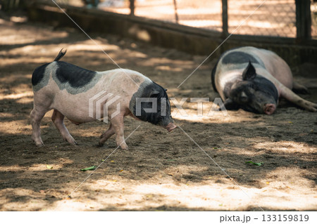 Happy Farm Pigs Enjoying Sunlight in a Natural Setting with One Pig Walking and Another Relaxing in the Shade on Soft Ground