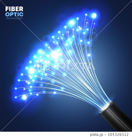 Fiber optic communication technology. Realistic vector cable with glowing bright blue light bundle of optic fibers. Telecommunication, data and Internet data transfer future tech background