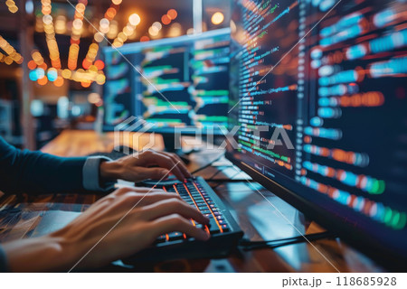 Programmer is hands on keyboard writing source code, on screen monitor showing writing code