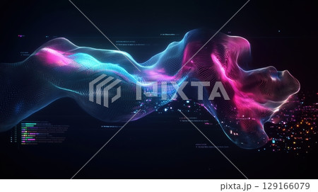 未來主義動漫插圖:一位機器人女性站在高科技音樂製作空間中