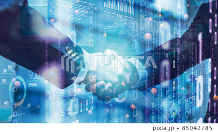 線上商務談判和電子合約簽署。商務人士隔著電腦螢幕握手。